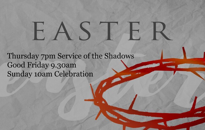 17 April Thursday evening 7pm Service of the Shadows. Takes about half an hour and gives you the chance to reflect on the events leading up to the death of Jesus.